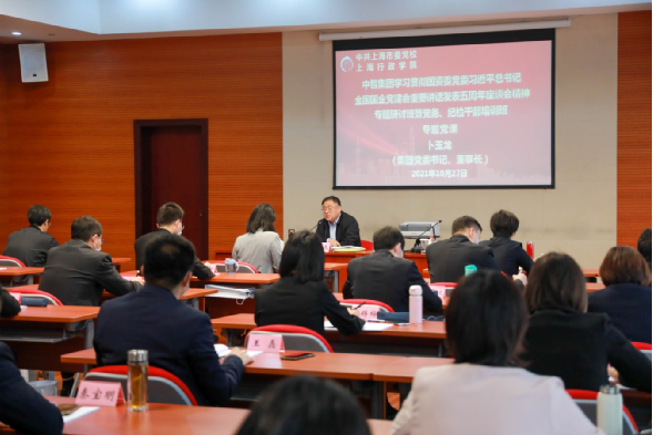 2021年10月26日,中智集團(tuán)黨委書記、董事長卜玉龍?jiān)谏虾J形h校(上海行政學(xué)院)為參加中智集團(tuán)學(xué)習(xí)貫徹國資委黨委習(xí)近平總書記全國國企黨建會(huì)重要講話發(fā)表五周年學(xué)習(xí)座談會(huì)精神專題研討班暨黨務(wù)、紀(jì)檢干部培訓(xùn)班全體學(xué)員,作了題為《提高政治站位,把握時(shí)代要求,切實(shí)提高國企黨建質(zhì)量》的黨課輔導(dǎo),他指出,要持續(xù)深化學(xué)習(xí)貫徹習(xí)近平總書記全國國企黨建會(huì)重要講話精神,按照國資委黨委“八個(gè)牢牢把握”相關(guān)要求,扎實(shí)做好集團(tuán)改革發(fā)展和黨的建設(shè)各項(xiàng)工作,鞏固擴(kuò)大工作成果,全面提高黨的建設(shè)質(zhì)量水平,更好引領(lǐng)保障高質(zhì)量發(fā)展。集團(tuán)總經(jīng)理助理,中智上海公司黨委書記、副總經(jīng)理李雙主持。